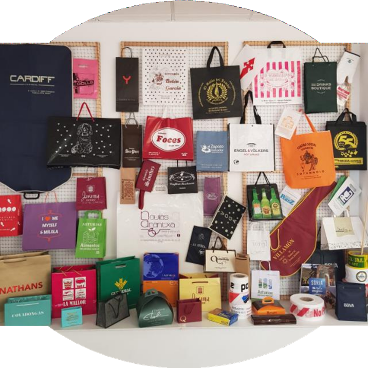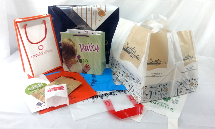 Existen muchos modelos de bolsas. Partiendo del material que el cliente haya elegido (papel, plástico, non woven…) imprimimos y confeccionamos la bolsa.